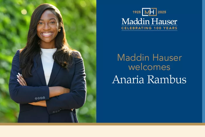 Maddin Hauser is pleased to announce that Anaria Rambus has joined the firm as an associate. Newly admitted to the State Bar of Michigan in 2025, Anaria will support several Maddin Hauser practices.